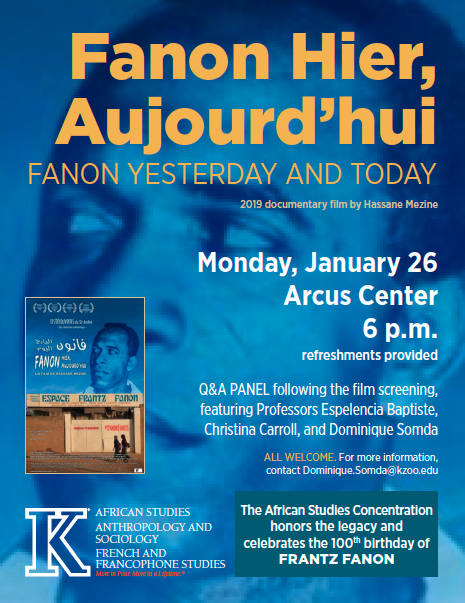 After the film, faculty from Kalamazoo College will lead a conversation with the audience about Fanon’s continuing relevance: